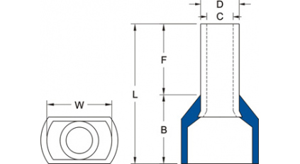 Изолированный кабельный обжимной втулочный наконечник для проводов; 2х1.5 мм.кв.; матер.: обжимной гильзы - медь лужёная, защитной гильзы -нейлон; гильза 12 мм; цвет: черный. F = 12 мм, L = 19.5 мм, W = 6.4 мм, B = 7.5 мм, D = 2.6 мм, С = 2.3 мм. Max 18A