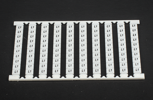 Маркер для клеммников DIN (DKK2.5, SK2.5, S4K2.5, SGK2.5, SG4K2.5, PM2.5, WPM2.5, WPPM2.5, WDKM2.5, WDDKM2.5. Ширина 5.1 мм. Вертикальная печать. Пластина белая, символы черные. 1 пл. - 100 симв. Символы: L1