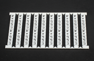 Маркер для клеммников DIN (DKK2.5, SK2.5, S4K2.5, SGK2.5, SG4K2.5, PM2.5, WPM2.5, WPPM2.5, WDKM2.5, WDDKM2.5. Ширина 5.1 мм. Горизонтальная печать. Пластина белая, символы черные. 1 пл. - 100 симв. Символы: L1, L2, L3, N, PE