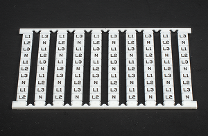 Маркер для клеммников DIN (DKK2.5, SK2.5, S4K2.5, SGK2.5, SG4K2.5, PM2.5, WPM2.5, WPPM2.5, WDKM2.5, WDDKM2.5. Ширина 5.1 мм. Вертикальная печать. Пластина белая, символы черные. 1 пл. - 100 симв. Символы: L1, L2, L3, N