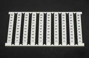 Маркер для клеммников DIN (UDK1.5, DK2.5, KDK2.5, DKES1.5, SGK4, SG4K4). Ширина 5.1 мм. Горизонтальная печать. Пластина белая, символы черные. 1 пл. - 100 симв. Символы: 1 - 10