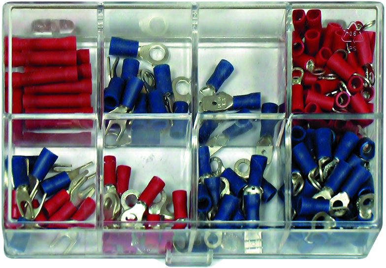 Набор кабельных наконечников в пластиковой коробке. Изолированные кольцевые клеммы под винт М3.5, М4, М5 .вилочные клеммы под винт М3.5, М4. Разъемные клеммы 6,3 мм. Соединительные трубки под обжим.